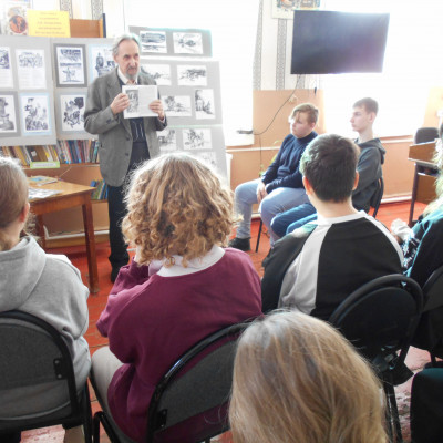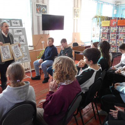 Продолжилась экскурсия встречей с художником, нашим земляком, почетным членом Союза Художников России по Воронежской области Химичевым Александром Владимировичем. В библиотеке проходит выставка иллюстраций Александра Владимировича «Хроники ратного подвига», посвященная 80-летию Победы в Великой Отечественной войне и Году защитника Отечества. Александр Владимирович рассказал воспитанникам школы искусств о средствах композиции, использованных в графике, о том, какими материалами он работал, а также судьбе и жизни тех, кто изображен в его композициях, их характере, жизни и подвигах, в каких книгах можно увидеть эти иллюстрации. Встреча прошла в теплой атмосфере. С большим интересом учащиеся школы искусств слушали художника, ведь возможно будущее кого-то из них будет связано с изобразительным творчеством, и они будут уже через свои произведения рассказывать миру о жизни.