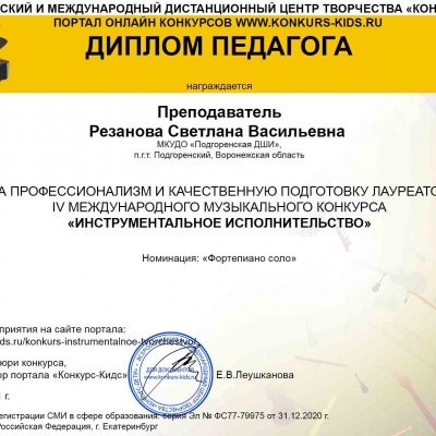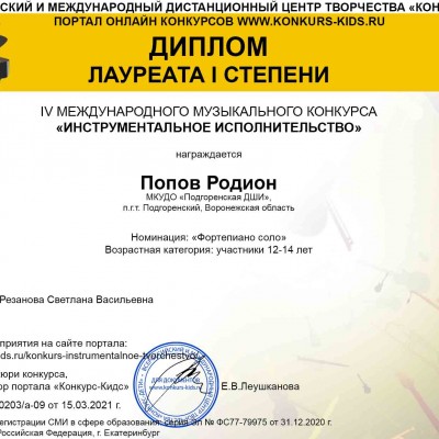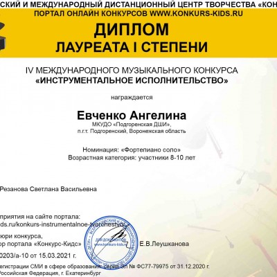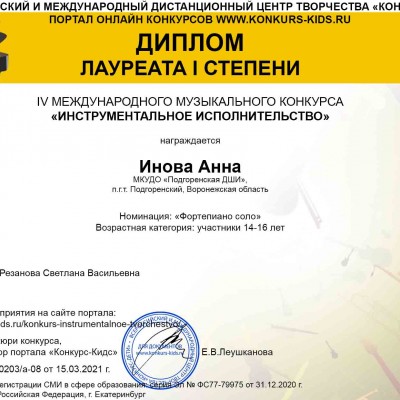 15 марта учащиеся «Подгоренской ДШИ» по классу «фортепиано» преподавателя Резановой С.В. - Евченко Ангелина (2 класс), Попов Родион (5 класс) и Инова Анна (8 класс), приняли участие в IV Международном музыкальном конкурсе «Инструментальное исполнительство» в номинации «фортепиано соло».
