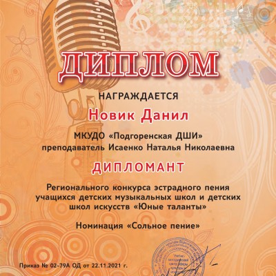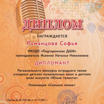 В конце ноября, в городе Воронеже состоялся региональный конкурс эстрадного пения учащихся детских музыкальных школ и детских школ искусств "ЮНЫЕ ТАЛАНТЫ", в котором приняли участие учащиеся отделения сольного пения: Романцова Софья и Новик Данил в номинации «Сольное пение» (преподаватель Исаенко Н.Н.). За исполнение двух разнохарактерных песен дети награждены дипломами ДИПЛОМАНТОВ.