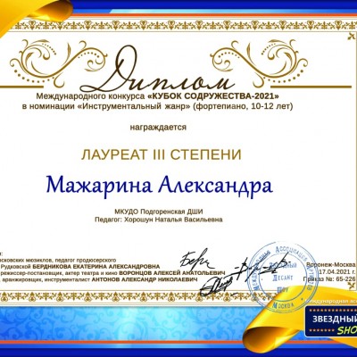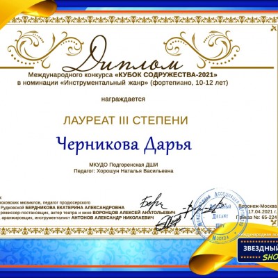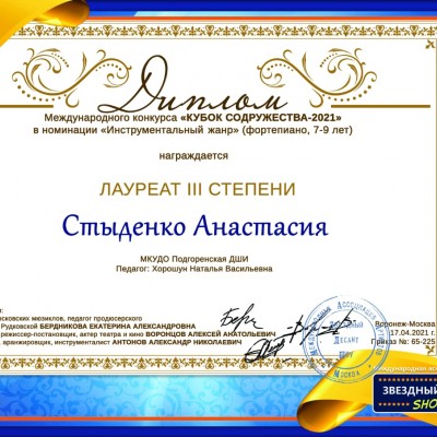 17 апреля в Воронеже состоялся Международный конкурс "Кубок содружества – 2021" при информационной поддержке Министерства культуры РФ. Цели конкурса – это развитие эстетического и нравственного воспитания подрастающего поколения, пропаганда здорового образа жизни. Независимое и компетентное жюри приглашено из Москвы. Участники исполнили по одной пьесе. Учащиеся фортепианного отделения преподавателя Хорошун Н.В. МКУДО «Подгоренская ДШИ» приняли участие в номинации «Инструментальный жанр».