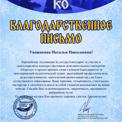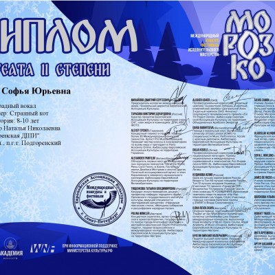 Нам пришли результаты с Международного конкурса-фестиваля исполнительского искусства "МОРОЗКО" г. Санкт-Петербург, в котором приняла участие учащаяся отделения сольного пения Романцова Софья в номинации «Эстрадный вокал» (преподаватель Исаенко Н.Н.).