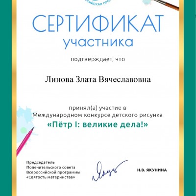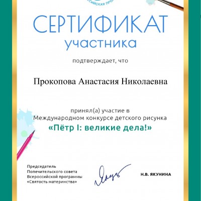 По итогам конкурса все учащиеся получили сертификаты участников Международного конкурса детского рисунка «Пётр I: великие дела!».