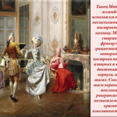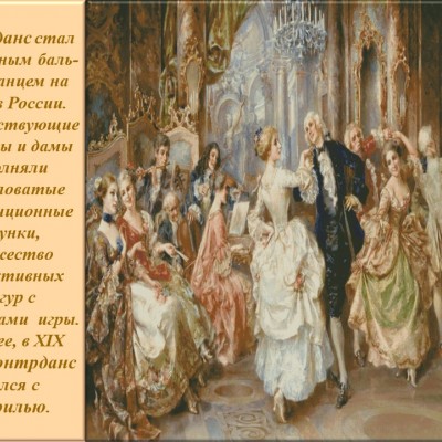 Именно с начала регулярного проведения ассамблей в Россию пришла культура светского танца: полонеза и менуэта, контрданса и англеза. Танцы вносили разнообразие в деловую атмосферу петровских ассамблей. Наряду с функцией развлечения, ассамблеи первыми в России начали формировать танцевальную культуру петербургского общества. Танцы создавали условия для установления более тесных контактов между присутствующими. Петр осознавал значение ассамблей в культурных преобразованиях, позволяющих приобщать подданных к новым моделям жизни. Параллельно увеселительным и шутовским формам досуга, он внедрял ассамблеи как центры обучения и выработки норм и навыков социально-культурной жизни.
