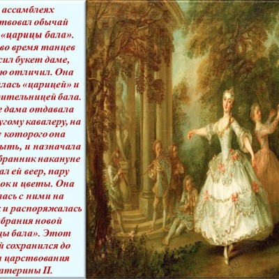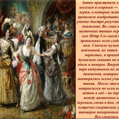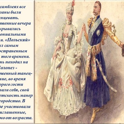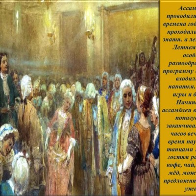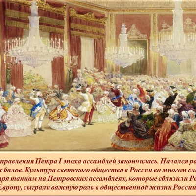 Многие исследователи совершенно справедливо считают ассамблеи первыми русскими балами, на которые гости являлись одетыми по последней моде, где совершенствовались в танцах и изысканных манерах. Но ассамблеи были не только местом развлечений, они помогали в борьбе с косным патриархальным бытом, способствовали формированию нового вкуса, интереса к общественной жизни.