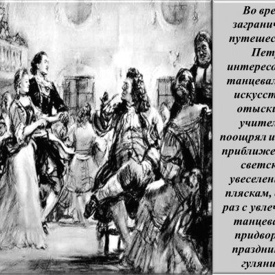 Большие преобразования произошли и в сфере культурной жизни России. Во время заграничных путешествий Петр интересовался танцевальным искусством, отыскивал учителей, поощрял интерес приближенных к светским увеселениям и пляскам, сам не раз с увлечением танцевал на придворных праздниках и гуляниях. Он всячески старался внушить дворянству интерес к общественной жизни, вывести женщин из теремов, познакомить с достижениями западной культуры.