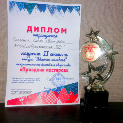 20 августа в Молодёжном центре г. Россошь состоялся межрегиональный фестиваль "Праздник мастеров", в котором приняли участие преподаватели МКУДО «Подгоренская ДШИ» Красникова Александра Андреевна и Остренко Елена Викторовна. Они представили свои работы на «Выставке художников» из Россошанского, Подгоренского, Кантемировского районов, г. Воронежа. Всего было представлено 80 работ в разных жанрах и техниках. А также приняли участие в конкурсе «Яблочко наливное», по итогам которого Остренко Елена Викторовна стала Лауреатом IIстепени. Участники выставки и конкурсов были награждены дипломами, а победители памятными подарками.