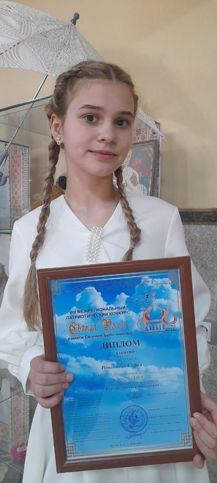 В феврале 2025 г. учащиеся отделения сольного пения Бурка Дарина, Разгуляев Артем, вокальный ансамбль «Соловушка» (преподаватель Абросимова О.И.) Детской школы искусств приняли участие в I туре VIII Межрегионального патриотического конкурса «Святая Россия», посвященного памяти выпускника училища Евгения Булочникова.