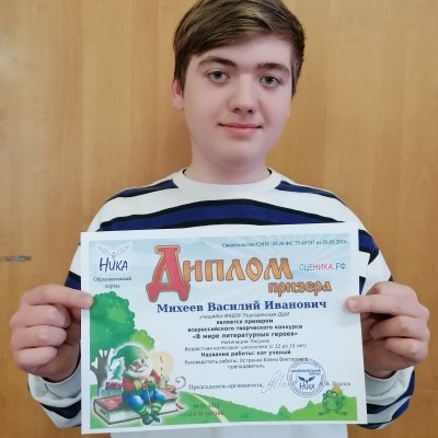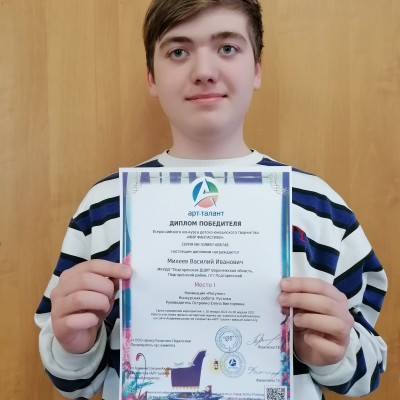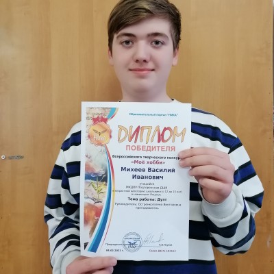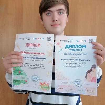 Михеев Василий учащийся 8 класса художественного отделения МКУДО «Подгоренская ДШИ» (преподаватель Остренко Е.В.), в этом году пятнадцатилетний выпускник отделения активно принимает участие во внутришкольных, а так же дистанционных всероссийских и международных конкурсах. Не однократно занимал призовые места. Победитель Всероссийского творческого конкурса «Мое хобби» и «Моя мама лучшая на свете», призер Всероссийского творческого конкурса «В мире литературных героев», «Новогодние фантазии» (образовательный портал «Ника»). Василий имеет диплом победителя Всероссийского детско-юношеского творчества «Мир фантастики» (Арт-талант г. Санкт-Петербург) и диплом 2 место за участие в международном фестивале детско-юношеского творчества и педагогических инноваций Кубок России» по художественному творчеству в г. Санкт-Петербурге. Композиции этого ученика отличаются индивидуальностью, стилем, выразительностью. Василий работает в направлении «Графика» и компьютерная графика, а так же пишет копии картин художников масляными красками. В будущем мечтает продолжить творческий путь в художественном творчестве.