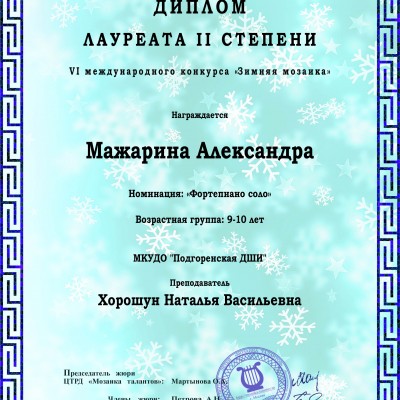 Дипломами Лауреатов IIстепени награждены Мажарина Александра (4 класс) и Черникова Дарья (4 класс).