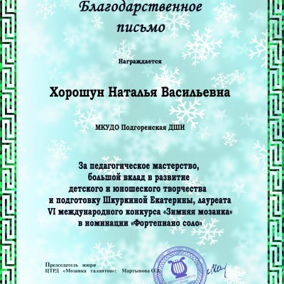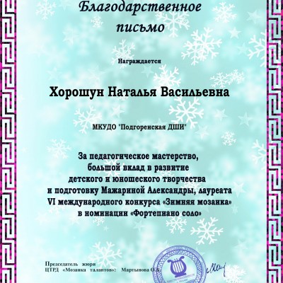 В целях выявления талантливых детей в сфере фортепианного искусства и создания для них возможностей демонстрировать результаты своего творчества широкой публике для удовлетворения их потребностей в общественном признании, воспитании и развития личности ребенка состоялся в Москве VI Международный фортепианный дистанционный конкурс «Зимняя мозаика».