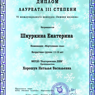 Диплом Лауреата III степени - Шкуркина Екатерина (5 класс).