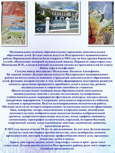 Хочется отметить, что все достижения и результаты Детской школы искусств неразрывно связаны с деятельностью администрации Подгоренского муниципального района и отделом культуры, которые всесторонне поддерживают наши творческие инициативы, направляют и помогают в создании условий для духовного и нравственного развития подрастающего поколения нашего района, и это позволяет нам с гордостью оглядываться назад и с оптимизмом смотреть в будущее.